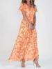 Fashionable Floral Chiffon Beach Dress with V Neck Short Sleeves Ruffle Waist Cinching Long Skirt