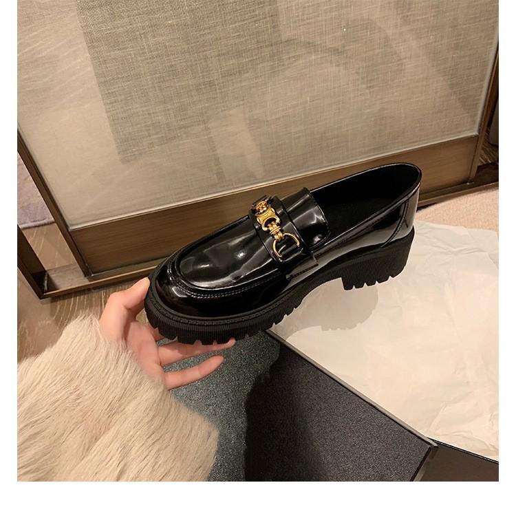 Sheepskin version~ Triumph buckle platform leather black small leather shoes women's small gold buckle thick heel single shoes muffin shoes loafers