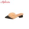 Zapatillas de Pelo de Conejo Real Cálidas Rosas y Negras Aphixta Zapatos de Mujer Invierno Punta Puntiaguda Tacón Cuadrado de 3 cm Zapatillas de Interior para Señora Talla 41