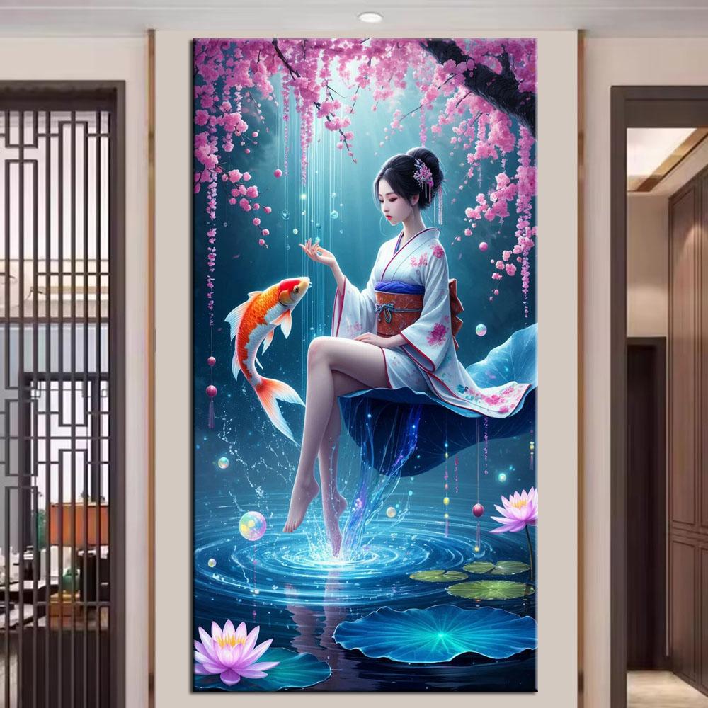 Large Size Mosaic DIY Full Diamond Painting Kits Art Beautiful Japanese Geisha and Koi Fish Embroidery Cross Stitch Rhinestones