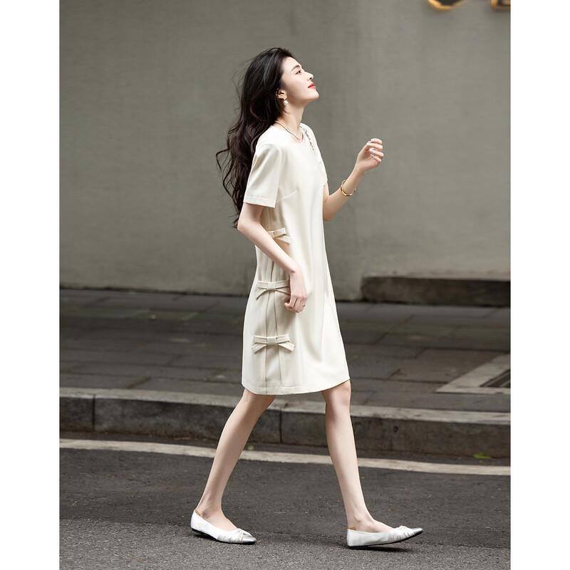 Demana Summer Elegant Handmade Bow Short Sleeve Shift Midi Dress