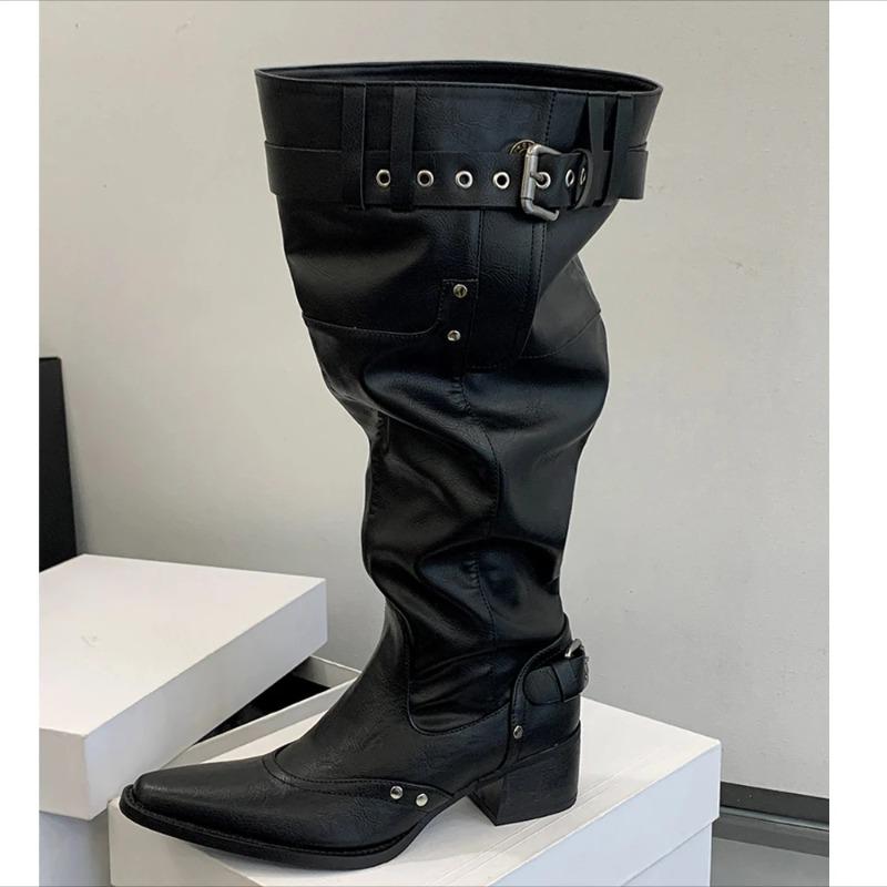 2025 Retro Design Pleated Pointed Toe Buckle Strap Women Knee-High Boots Low Heels Shoes Autumn Long Botas De Mujer