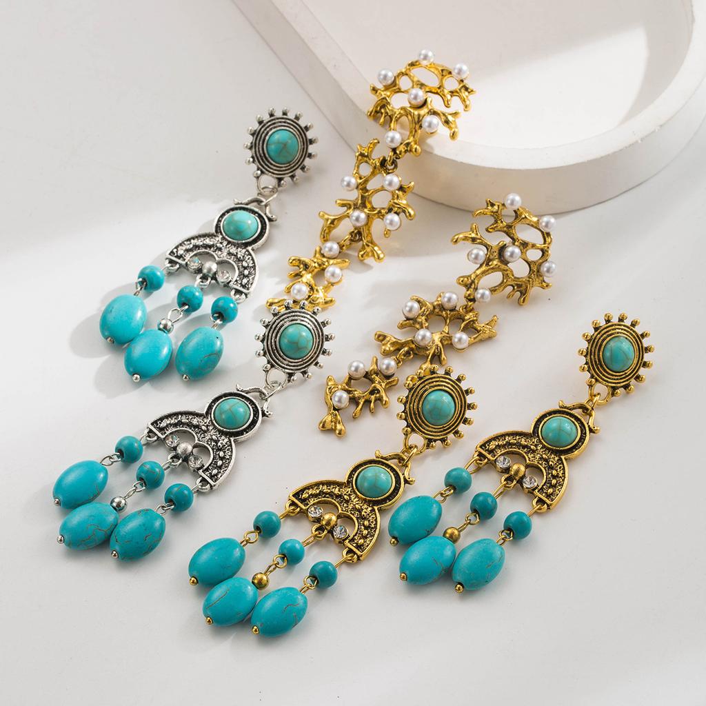 Turquoise Long Earrings Bohemian Ethnic Style Studs Vintage Pearl Inlaid Tassel Earrings for Women