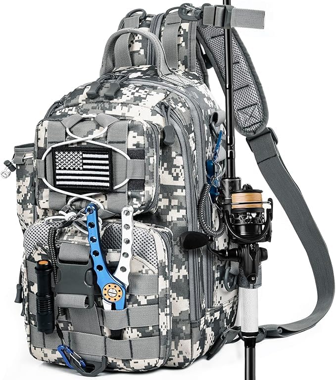 Rxakudedo Fishing Fishing Gear Shoulder Bag with Gear Tactical Fishing Gear Backpack for Outdoor Large Gray Camouflage Backpack, Rack, Fishing,
