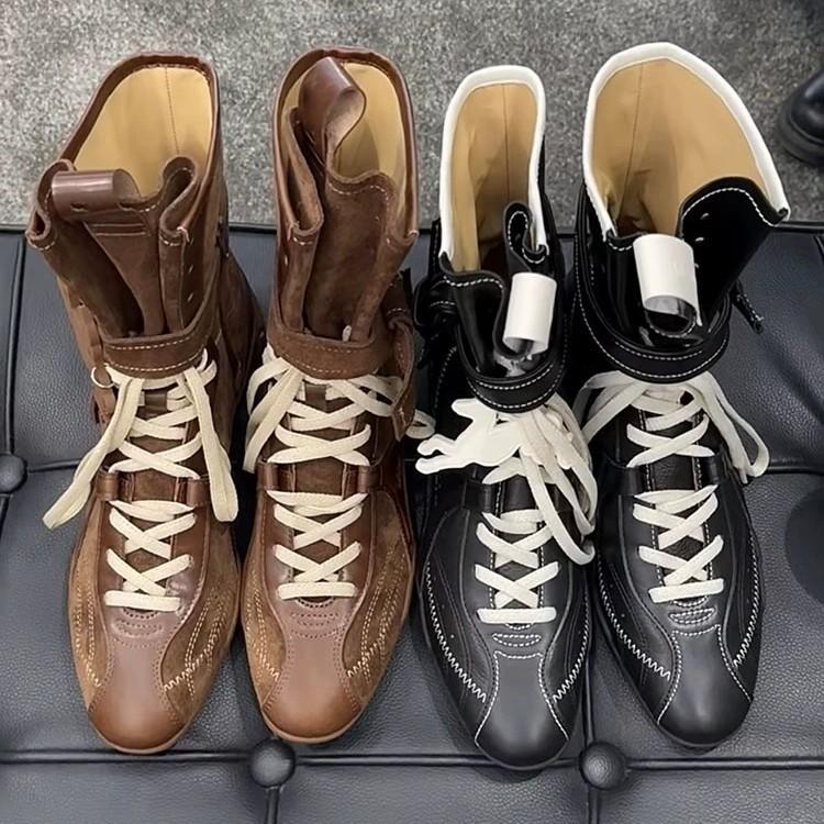 Serie de caza nicho botas de boxeo con aumento de altura interior para mujer 2025 nuevas botas de moda de tubo medio retro cuero genuino botas de entrenamiento alemanas