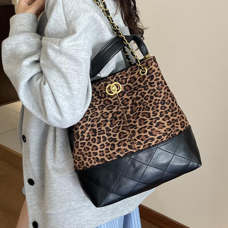 Versatile fashion leopard print niche diamond chain bucket bag 2025 femininity explosion casual portable messenger bag