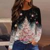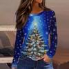 Moda Mujer Casual Bajo con Abertura Cuello Redondo Manga Larga Holgada Camiseta Estampada Navideña Top de Señora