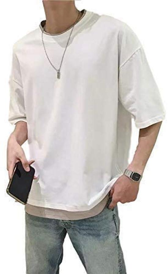Short Sleeve Solid Layered Loose [Four leaf] Men's T-Shirt, Simple, Color, Stylish, Look, Fit, 3/4 Sleeves, Spring/Summer (XL, White)