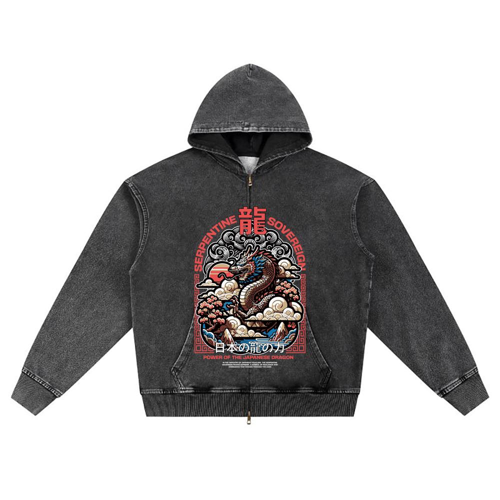 DTG print Knitted Denim Zip-Up Hoodie Japan Samurai Brother Print Zipper Hoodies
