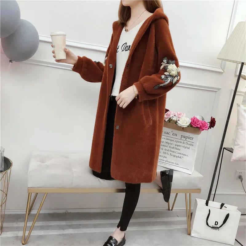 Women's Thickened Hooded Warm Imitation Mink Fleece Coat for Fall/Winter Mid-Length Wool Coat Female
