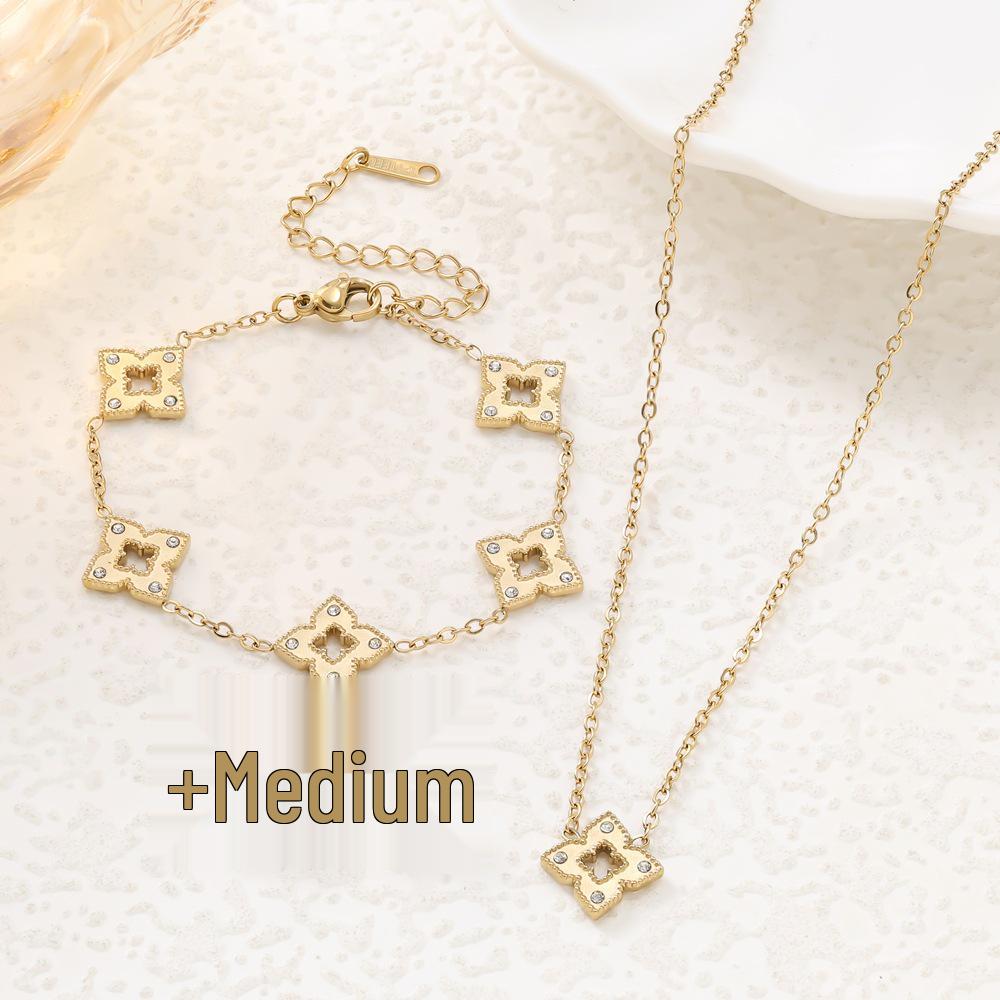Elegant Titanium Steel Clover Jewelry Set - Necklace, Bracelet, and Earrings in Four-Leaf Design with Micro-Inlaid Details for Women.