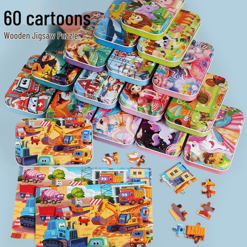 60-Piece Children's Wooden Cartoon Jigsaw Puzzle in Tin Box for Early Education