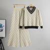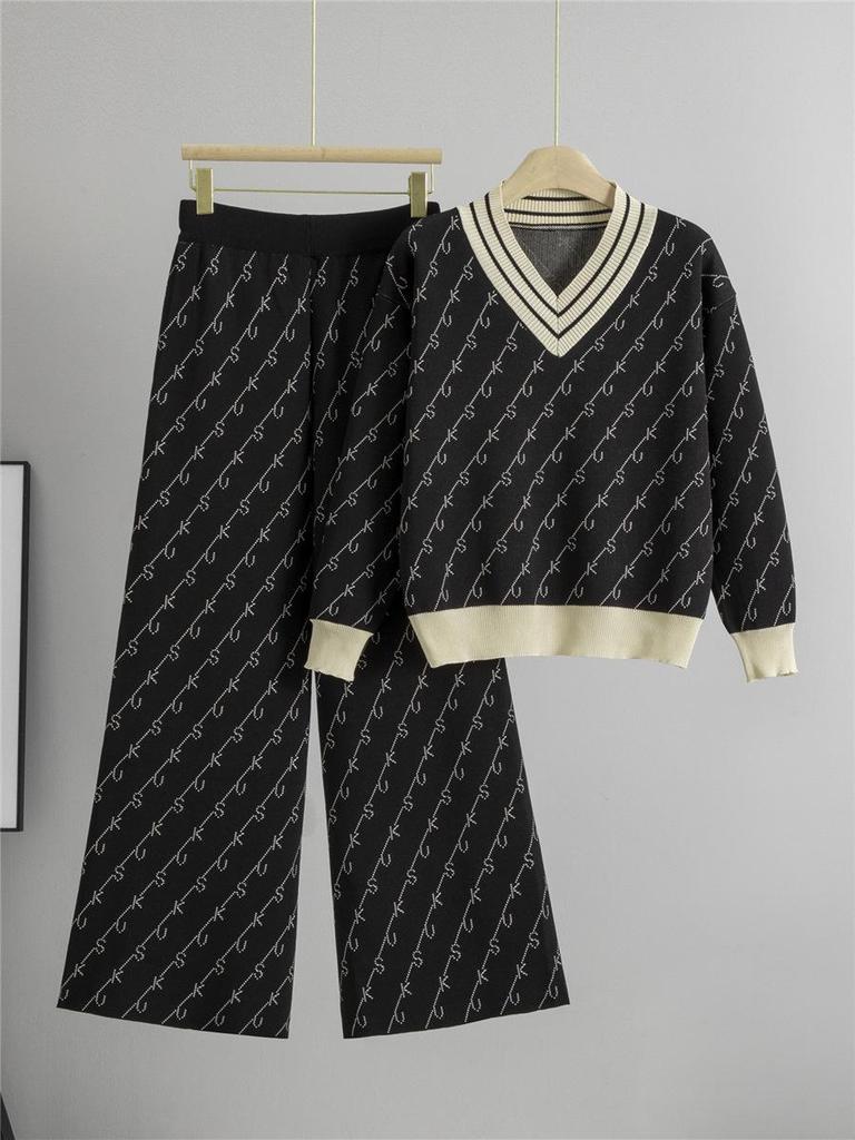 Elevate your wardrobe with this stylish women's set, perfect for autumn and winter. This ensemble features a color block pattern with knitted details, exuding a little fragrance style that's both casual and sophisticated. The set includes a cozy striped knit sweater and wide-leg pants, crafted from a luxurious wool blend and high-quality viscose material. Designed with a sportive flair, this set offers both comfort and fashion, making it an ideal choice for everyday wear or casual outings.