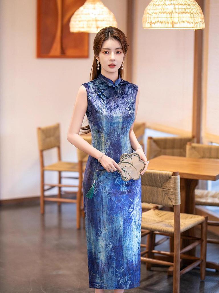 This elegant dress combines a modern retro style with a touch of tradition, perfect for the autumn season. Crafted entirely from high-quality spandex, it ensures a comfortable and flattering fit. The vibrant royal blue velvet adds a luxurious feel, and the sleeveless design allows for versatile styling. Ideal for both formal occasions and chic everyday wear, this cheongsam-inspired dress offers a unique blend of classic elegance and contemporary flair.