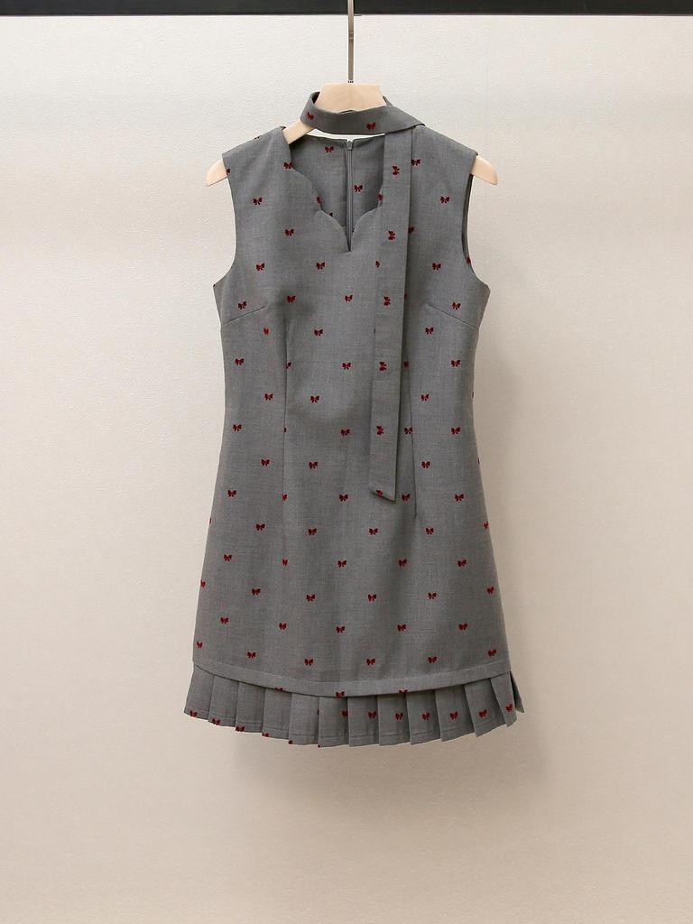 High-End Women's Autumn French Heiress Bow Print Pleated Vest Dress