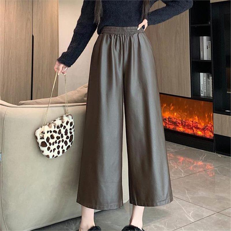 2024 Autumn/Winter Women's Casual Retro PU Leather Wide-Leg Pants - Petite Straight/Cropped Style