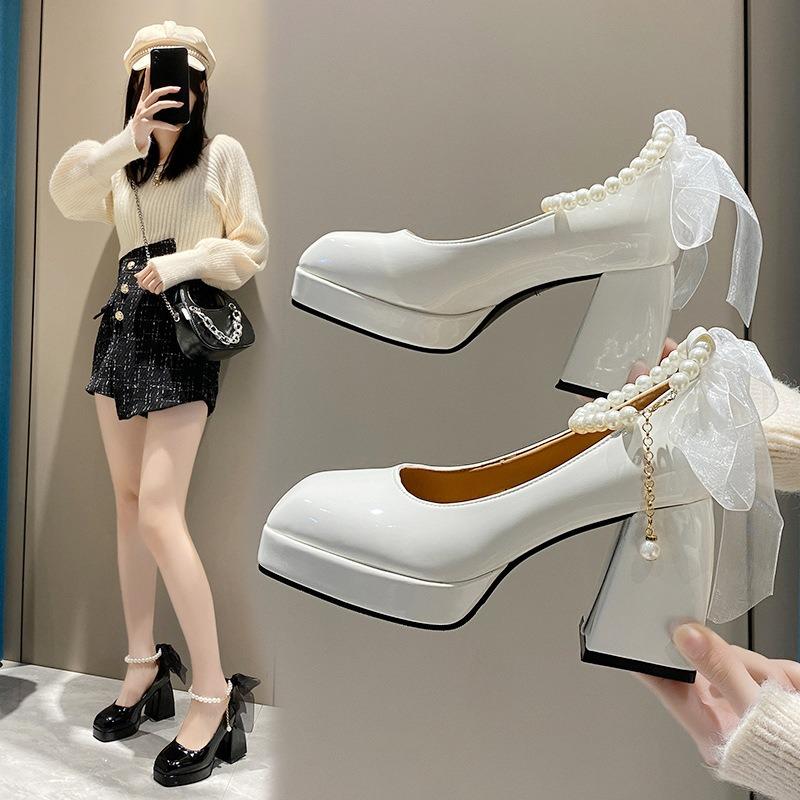 Spring and autumn new pearl chain thick heel simple square head large size high heels women Mary Jane shoes women