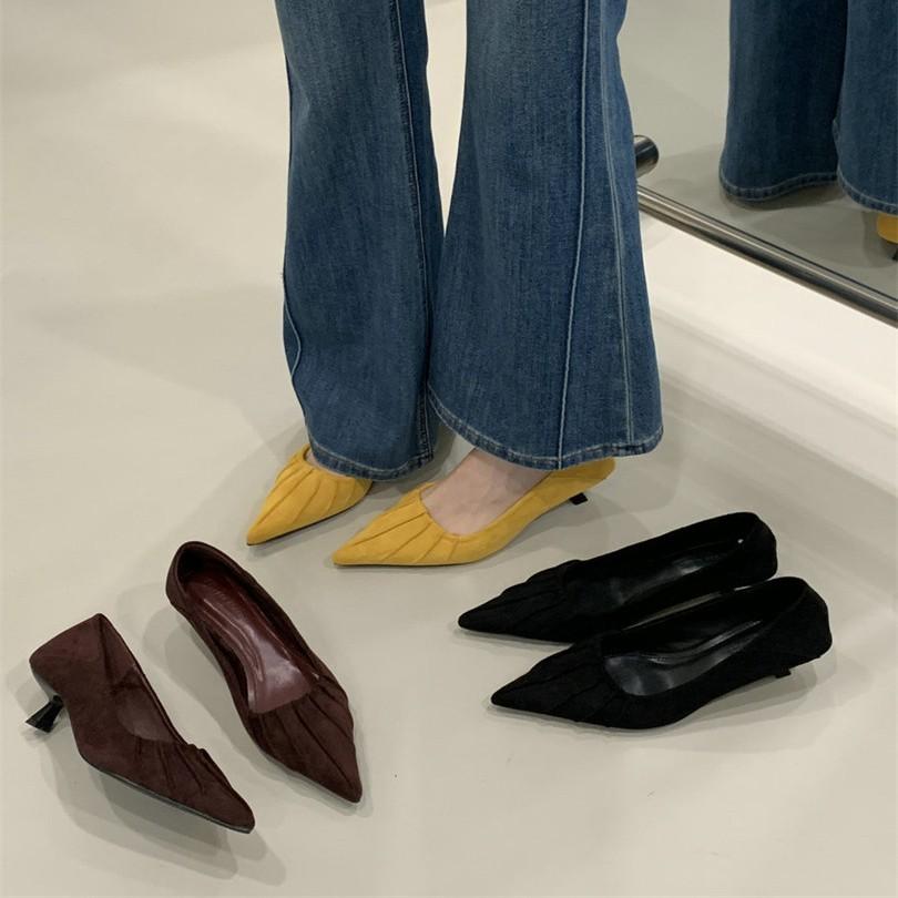 Zapatos individuales plisados de punta de tacón medio alto francés para gatito, zapatos de mujer verano 2025, temperamento, ante negro, zapatos de oficina