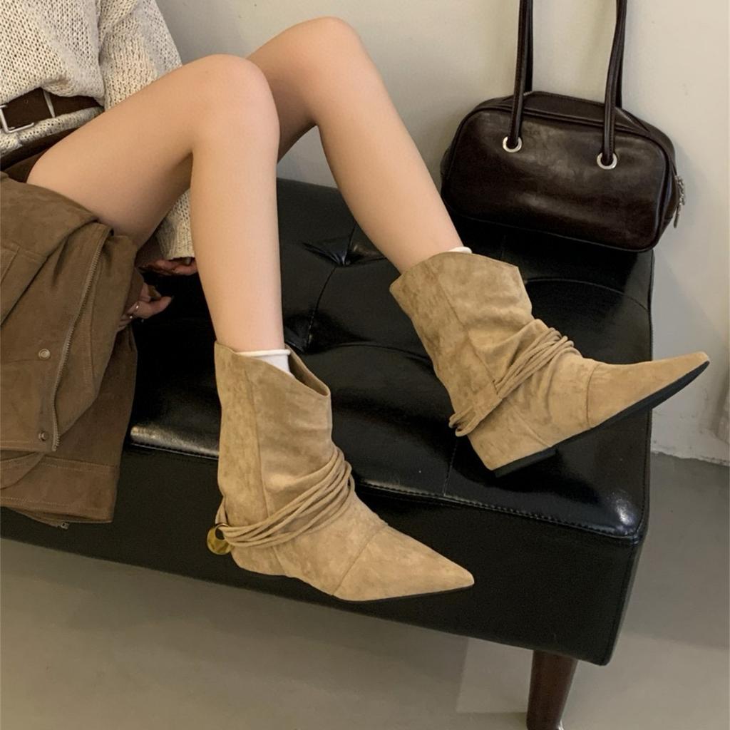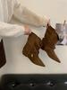 Botines marrones puntiagudos con realce interior, botines cortos, zapatos de mujer 2025 otoño e invierno, botas apiladas de media caña, botas cowboy occidentales