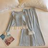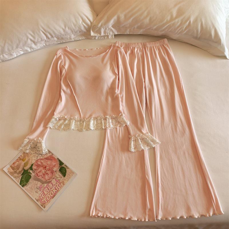 Women's Lace-Trim Pajama Set with Chest Pads - Long Sleeve & Pants, Sweet Influencer Style, Cotton Homewear for All Seasons