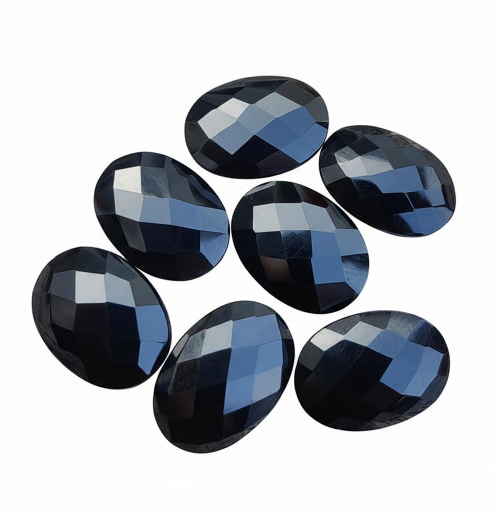 This lot consists of Natural Black Onyx Gemstones cut into a classic oval shape, a timeless and versatile choice for jewelry. Uniquely, they feature a faceted top—adding a subtle shimmer and brilliance—combined with a flat back, making them easy to set or glue for crafting. The deep, uniform black color of the Onyx offers a dramatic, elegant contrast, perfect for both modern and vintage-inspired rings, pendants, and earrings.