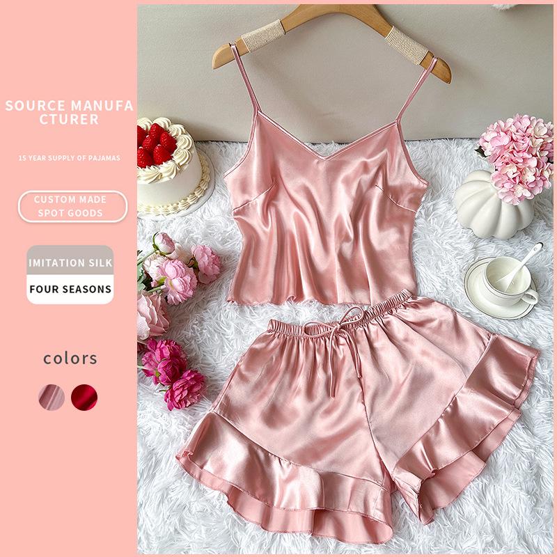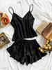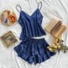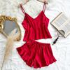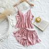 Discover elegance and comfort with this women's pajama set, featuring a backless design and spaghetti straps for a sexy yet sophisticated look. Made from imitation silk, this set offers a luxurious feel and a touch of glamour. The sleeveless top pairs effortlessly with fashionable shorts, creating the perfect loungewear ensemble for relaxing in style. Whether for a casual evening at home or a chic lounge outfit, this set combines fashion and comfort seamlessly.