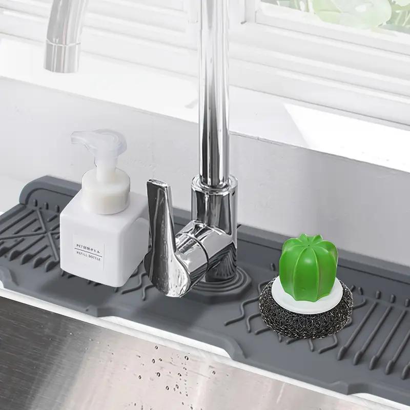 Kitchen sink splash guard, silicone faucet handle, drip tray, multi-purpose drying pad, sponge rack and bathroom countertop,