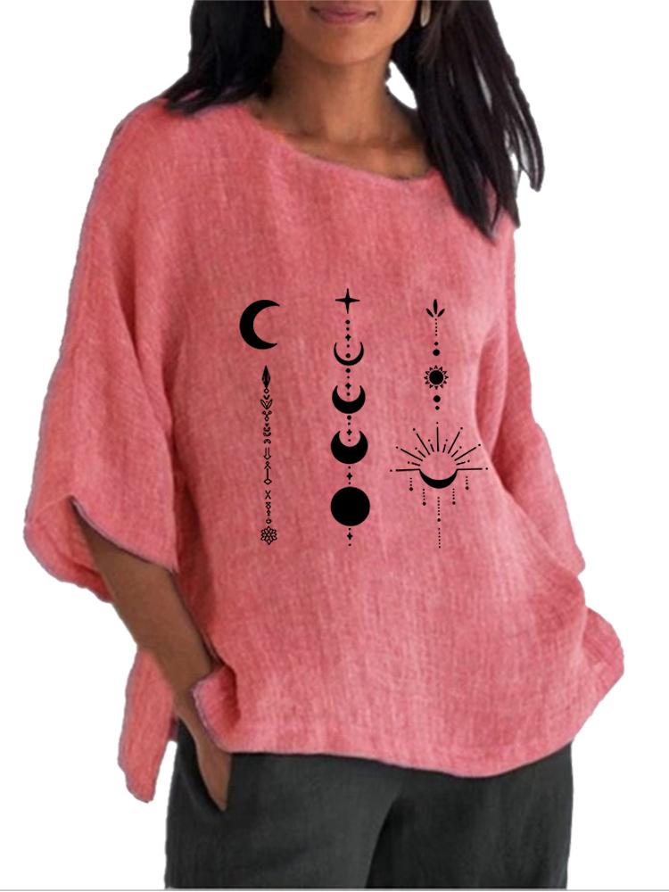 Camisa de Moda para Mujer con Cuello Redondo y Mangas 3/4 Estampada de Algodón y Lino para Primavera y Verano