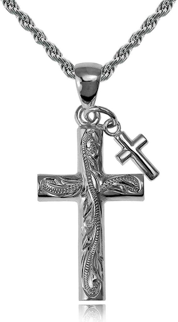 Leilani Hawaiian Jewelry Double Cross Scroll Pendant Necklace in Sterling Silver (40cm Rope Chain Included)