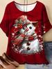 Elegant Snowman Printed Red Christmas Top for Women, Short Sleeved T-shirt, Casual Winter and Summer Women's Clothing