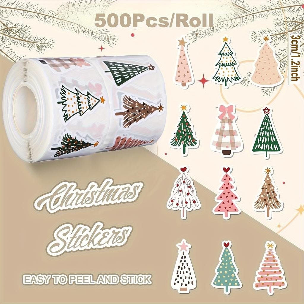 500pcs Christmas Boho Stickers - Pastel Christmas Tree Decals with Pine Trees, Polka Dots, Floral Bows - Self-Adhesive