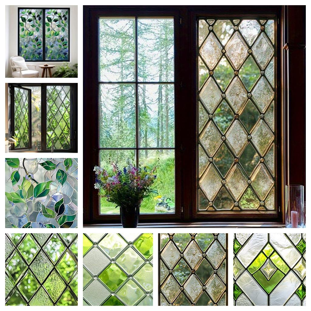Janela De Vidro Com Folhas Verdes Floresta Retrô Europeia - Adesivo De Remover - Decalques De PVC Para Sala De Estar E Porta De Banheiro 1 Vendidos