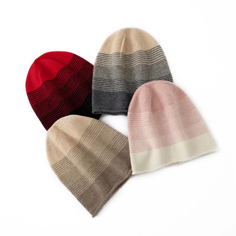 Women 100% Pure Cashmere Beanie Hat Gradient Color Striped Knit Winter Warm Soft Slouchy Skullies Cap Cold Weather Accessory