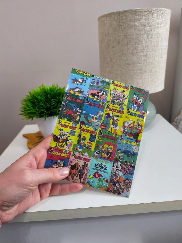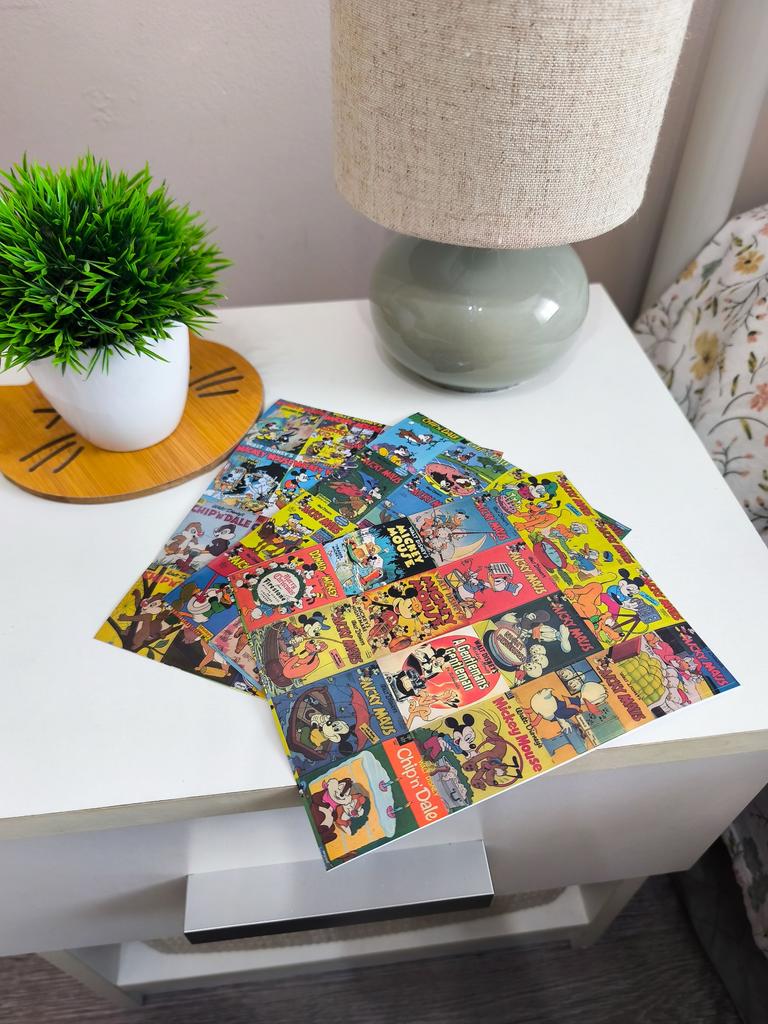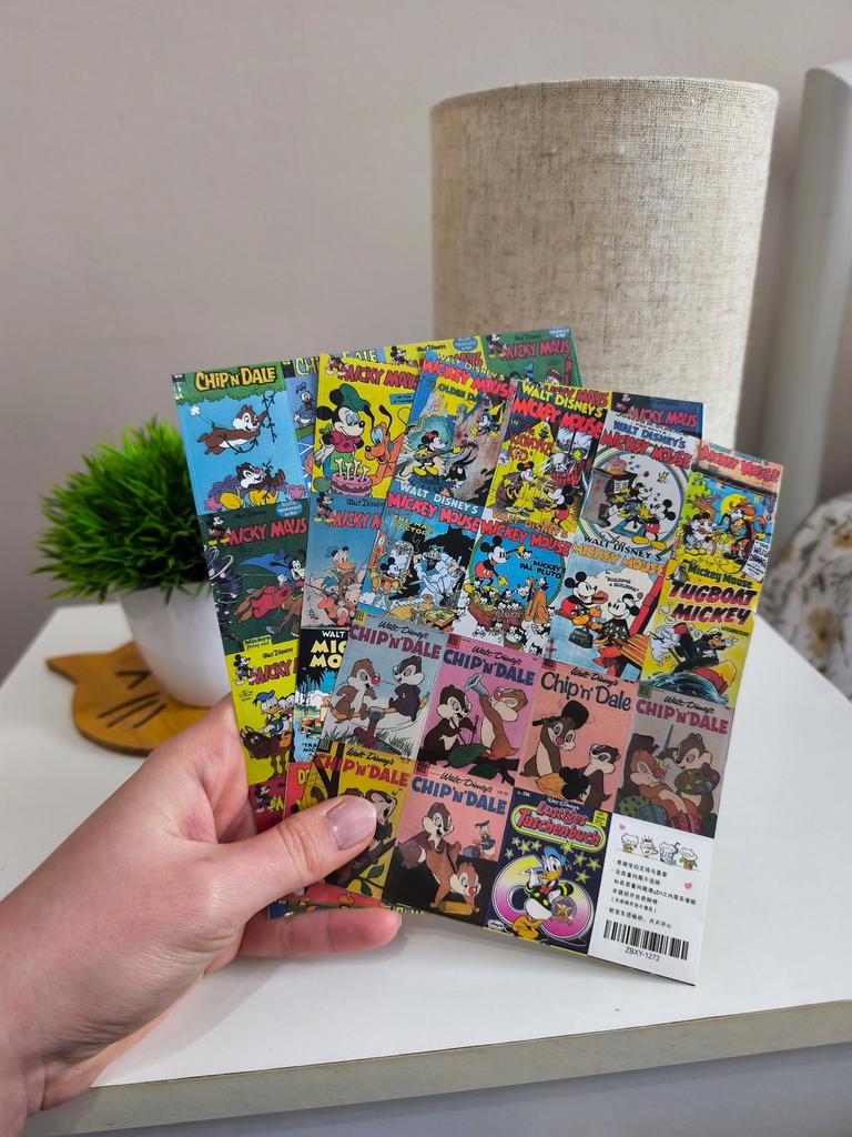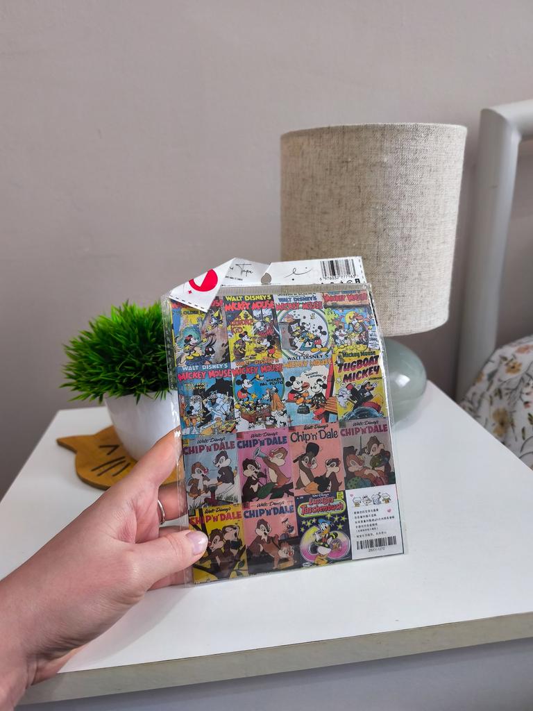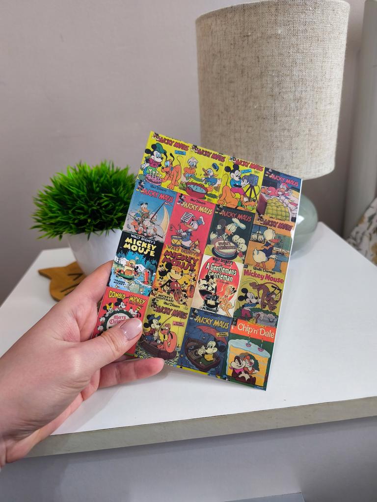 Un conjunto de pegatinas brillantes, estilizadas como portadas de cómics antiguos y dibujos animados clásicos.. 🔸Diseño: Cada pegatina es una miniatura retro con los personajes favoritos: Mickey y Minnie Mouse, el Pato Donald, Chip y Dale. 🔸Estilo: Realizados en la estética de las publicaciones impresas «old school» con colores intensos y un dibujo característico. 🔸Variedad: El set tiene muchos diseños diferentes, lo que permite decorarlos en el portátil, el cuaderno o la funda del teléfono, creando un collage único.. 🔸Calidad: Tarjetas gruesas con impresión nítida que parecen mini-pósteres de colección. Resultado: La elección ideal para los amantes de la nostalgia y los clásicos de Disney. Perfectos para decorar diarios personales o proyectos creativos.