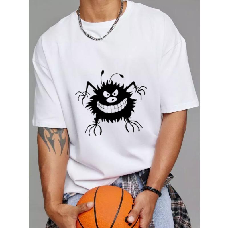 Cotton T Shirt White Black Cartoon Spider Print for Casual Wear