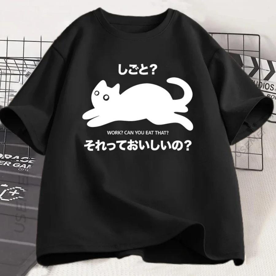 Kawaii Funny Black Cat T-Shirt Lazy Cat Tshirt Funny Cute Cat Tshirt Women Japanese Style Graphic Tees Women Clothing