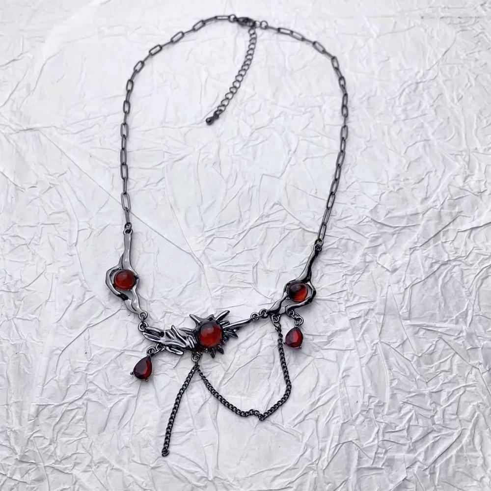 Punk Red Zircon Pendant Necklace Dark Gothic Silver Black Tassel Chain Choker Layered Hip Hop Collarbone Neck Chain for Women