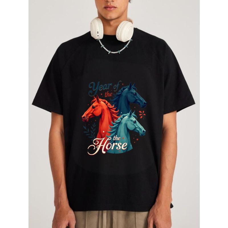 T-Shirt White Year of The Horse Print with Three Horses and Floral Design for Casual Wear