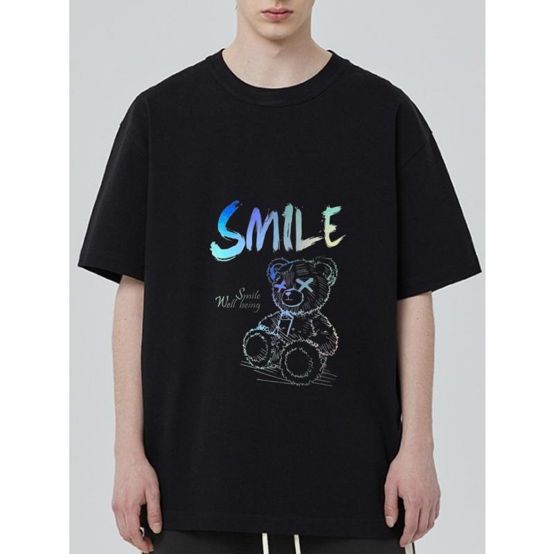 Smile Bear Graphic T Shirt Black Rainbow Text and Teddy Bear Print Casual Wear for Men and Women Streetwear Fashion Summer Outfit