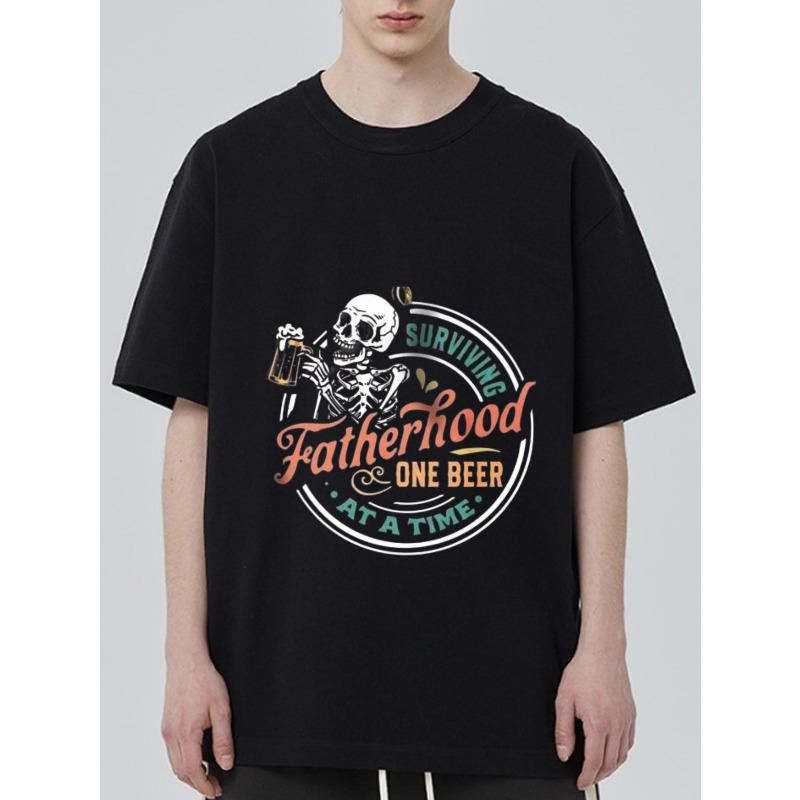 Men's T-Shirt Black Skeleton Holding Beer Surviving Fatherhood One Beer At A Time Graphic Print Casual Wear for Fathers Day or Everyday Use