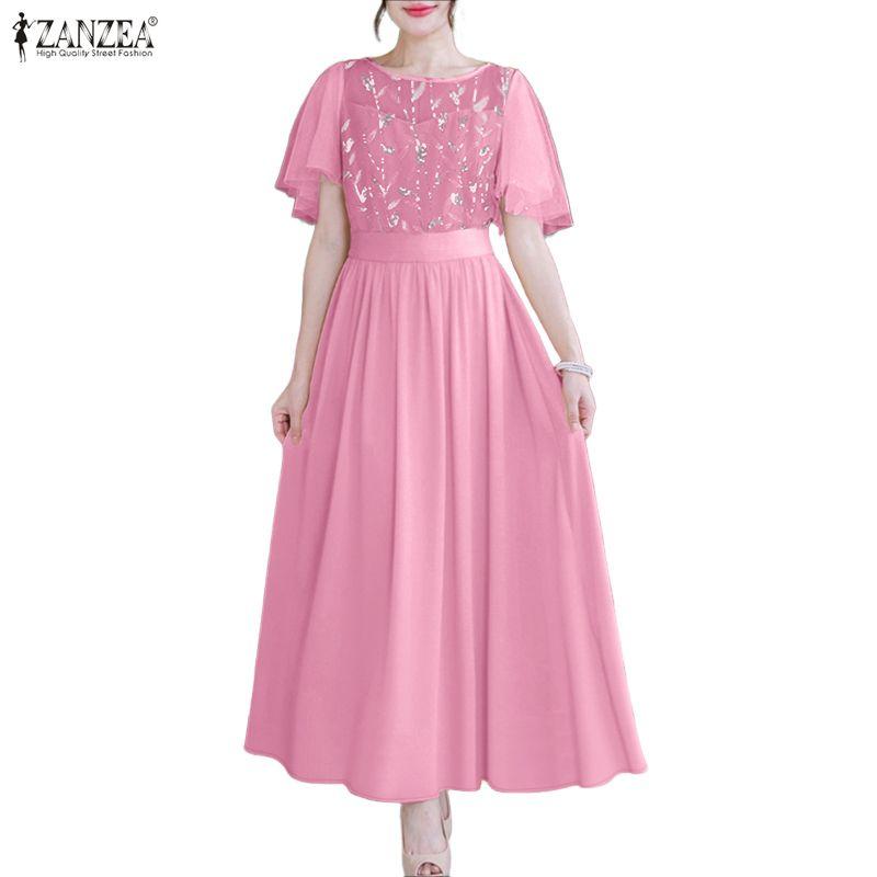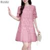 ZANZEA Women Casual Round Neck Mesh Splice Short Sleeve Loose Dress