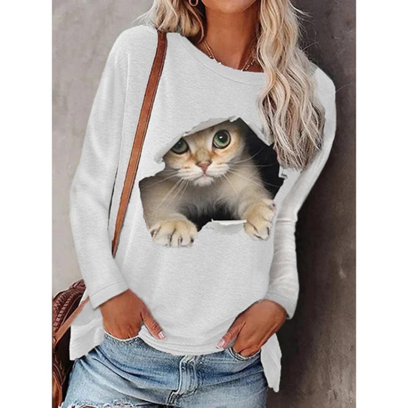 Trendy Autumn Winter New Fashion Round Neck Pullover Cat Print Long Sleeve Women's T-Shirt