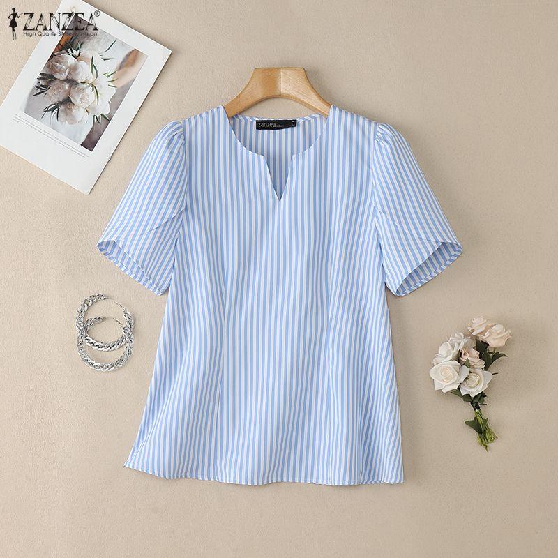 ZANZEA Women Casual V-Neck Loose Short Sleeve Stripe Blouse