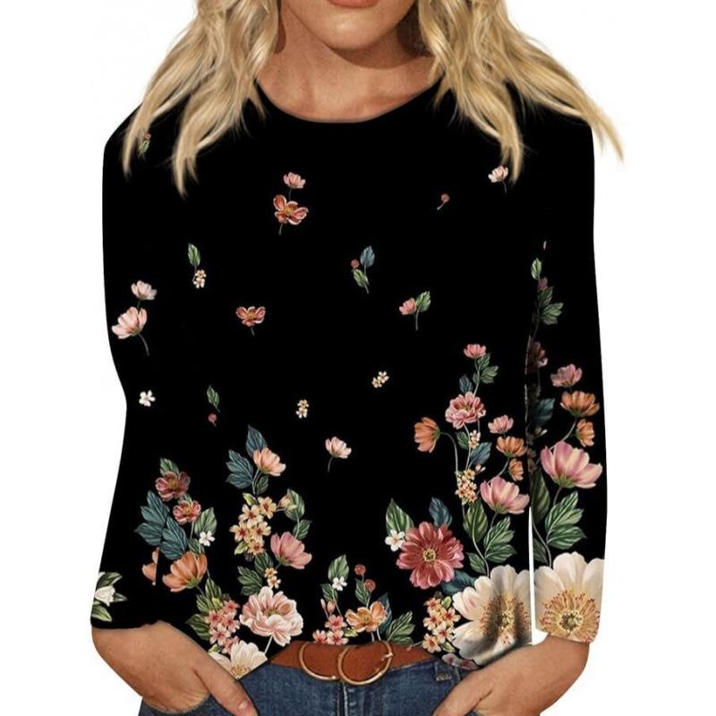 New Women's Round Neck Long Sleeve Loose Printed T-Shirt Ladies Top