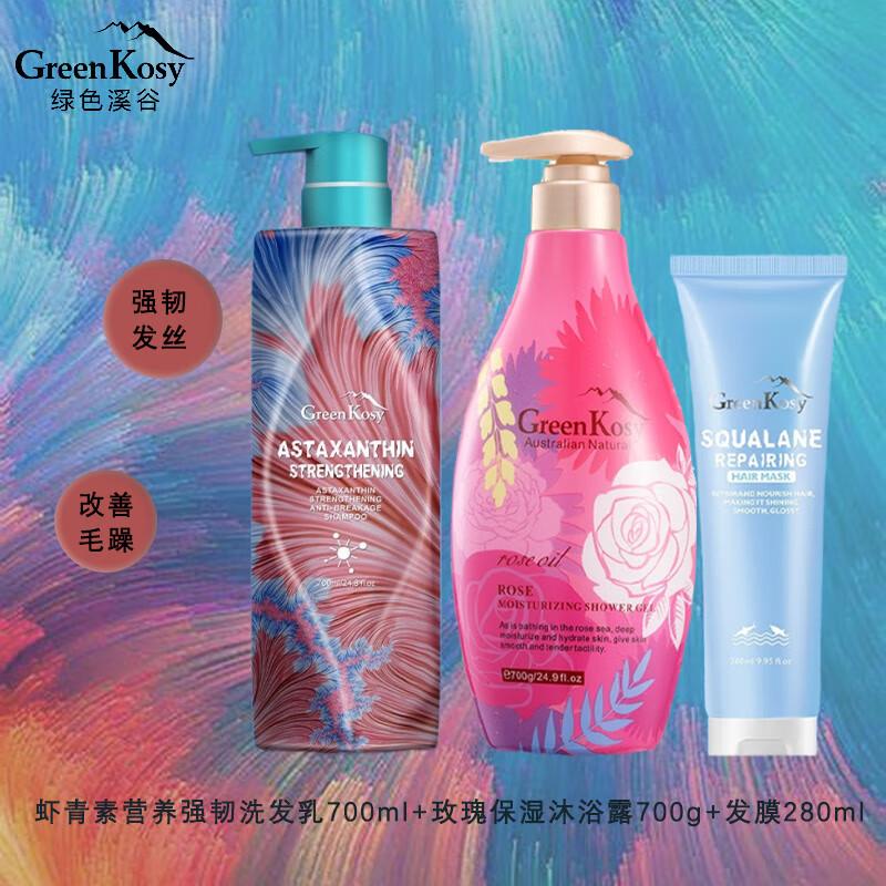 Experience comprehensive hair and body care with the Green Valley Astaxanthin Hair Care Trio Set. This luxurious set includes a 700ml Astaxanthin Nourishing Strengthening Shampoo, a 700g Rose Moisturizing Shower Gel, and a 280ml Repairing Hair Mask. Designed for normal hair and normal scalp, the shampoo offers volumizing, moisturizing, and repairing benefits for a fluffy finish. The shower gel provides deep hydration, while the hair mask restores and strengthens hair, leaving it vibrant and healthy. Achieve soft, supple skin and resilient hair with this complete regimen.