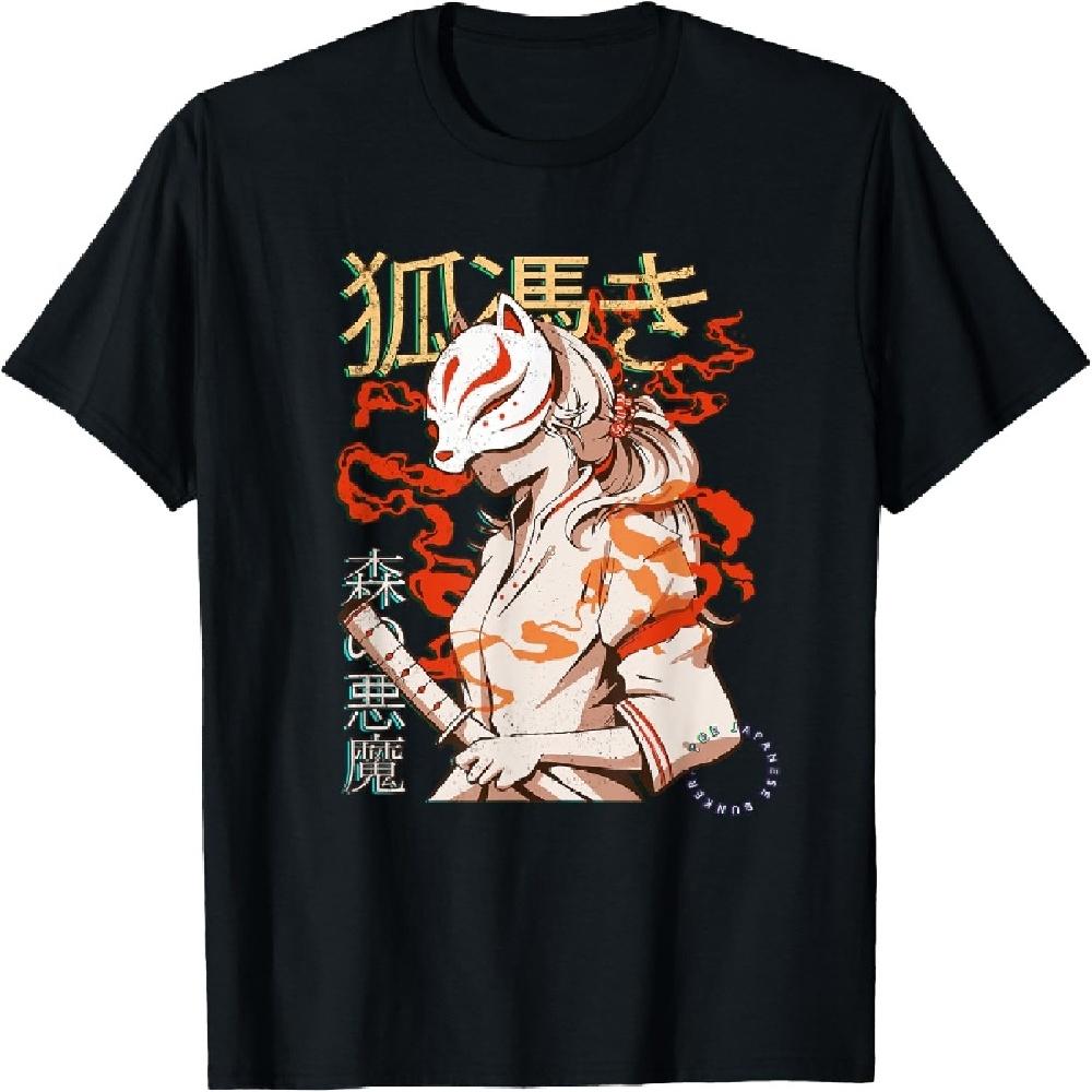 Aesthetic Japanese Kabuki Kitsune Mask Demon Samurai Girl T-Shirt
