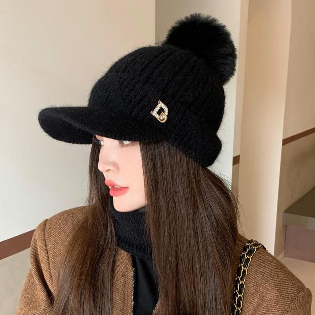 Women's Golf Hiking D Initial Winter Knit Pom Pom Hat