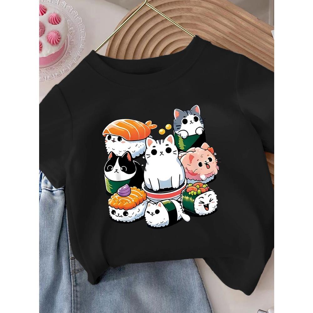Adorable Cat Sushi Cartoon Print Kid T-Shirt Soft Round Neck with Fun Food Design for Summer Casual Children Wear Clothing