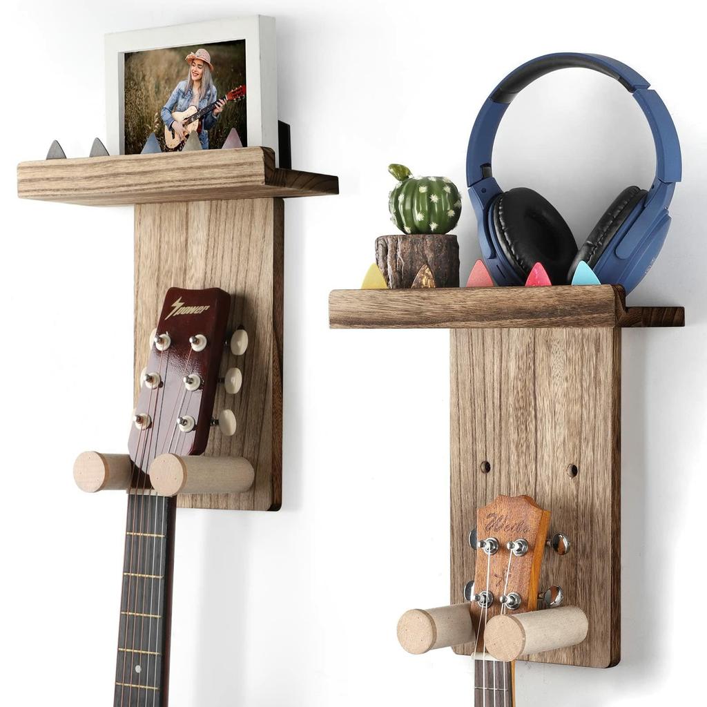 The true value of this guitar hanger is that it allows you to store your guitar and everyday items in one place. The tray, located just above your hanging guitar or ukulele, is ideal for storing things you might need after playing. You can quickly store your tuner, capo, or picks right there, eliminating the hassle of searching for them the next time you need them. This tray also has great utility in everyday life. It can be used as a designated spot for essential items that tend to get cluttered, like remote controls and glasses in the living room or keys and coins in the entryway. The warmth and functionality of the wood helps keep your instrument space free from clutter.
