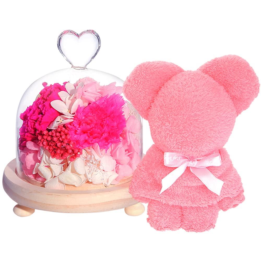 Teatsite Preserved Flower Arrangement, Pre-Wrapped, Heart-Shaped Glass Pot, 3 Flowers (Pink Carnations, Bear Towel Included)